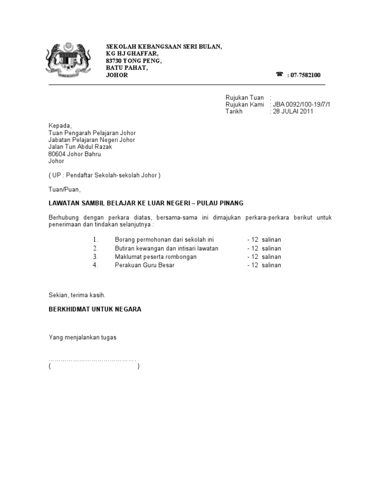 Surat Memohon Kebenaran Mengadakan Lawatan Sambil Belajar