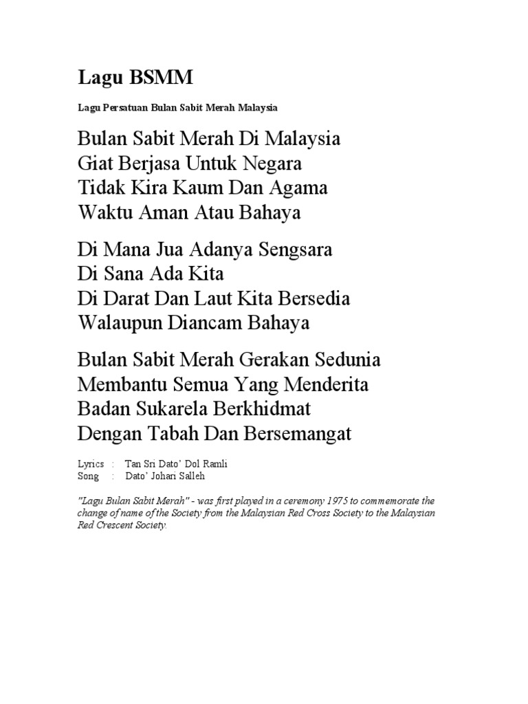 Lagu Persatuan Bulan Sabit Merah Malaysia Bulan Sabit Merah Di Malaysia Giat Berjasa Untuk Negara Tidak Kira Kaum Dan Agama Waktu Aman Atau Bahaya Bulan Sabit Merah Gerakan Sedunia Membantu Semua Yang Menderita Badan Sukarela Berkhidmat Dengan Tabah Dan Bersemangat Di Mana Jua Adanya Sengsara Di Sana Ada Kita Di Darat Dan Laut Kita Bersedia. Lagu Persatuan Bulan Sabit Merah Malaysia Muat Turun Lagu Views. Academia edu is a platform for academics to share research papers.