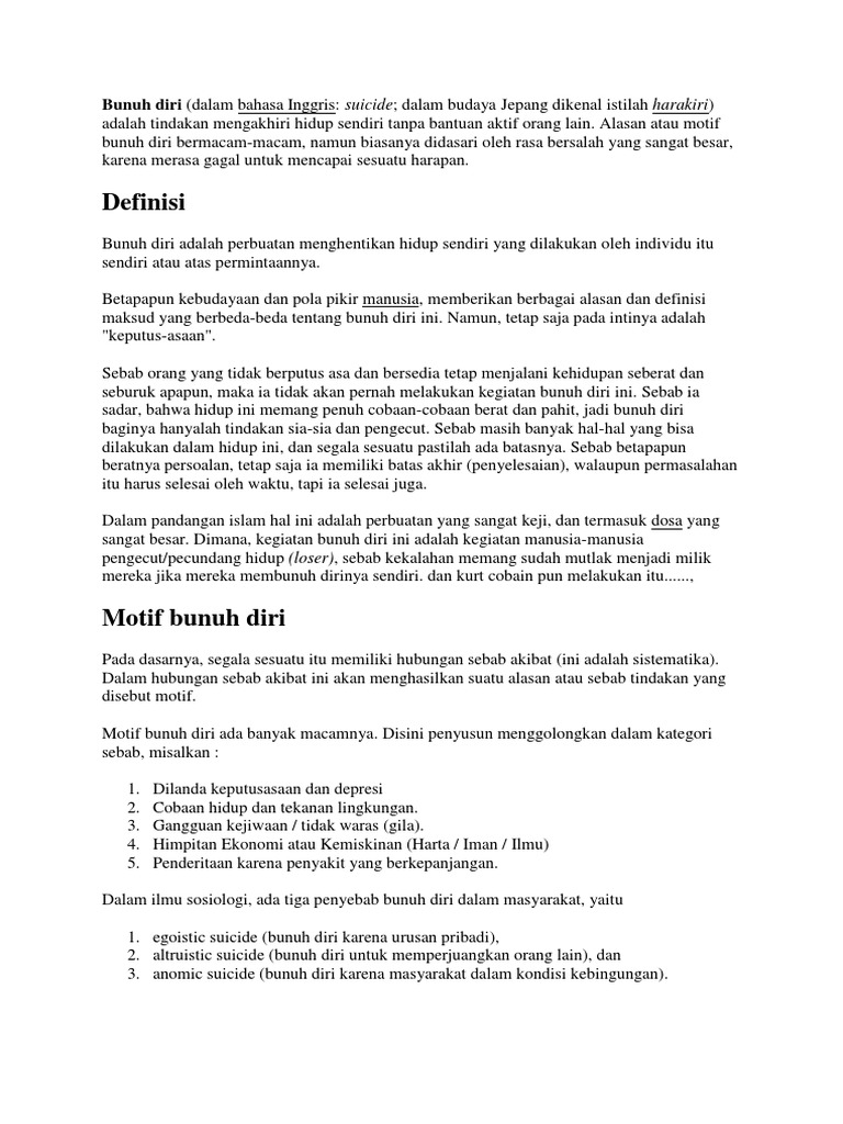 Bunuh diri bahasa Inggris. Bunuh diri noun Para pria muda diajarkan dasar pembenaran dari serangan bunuh diri dan eksekusi para mata-mata. Noor hamaddi bin pengiran ahmad pegawai adat istiadat jabatan adat istiadat negara jabatan perdana menteri.
