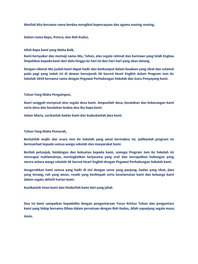 Bacaan doa pada awal majlis merupakan suatu perkara yang wajib dilakukan dalam setiap acara atau majlis rasmi sekolah. This is a collaborative program of the Ministry of Education Malaysia also known as Kementerian Pendidikan Malaysia KPM and the Royal Malaysia Police also known as Polis Diraja Malaysia PDRM to uphold the discipline of students and prevent them from committing wrongdoings. Program Pengesanan Pelajar Ponteng Harian.