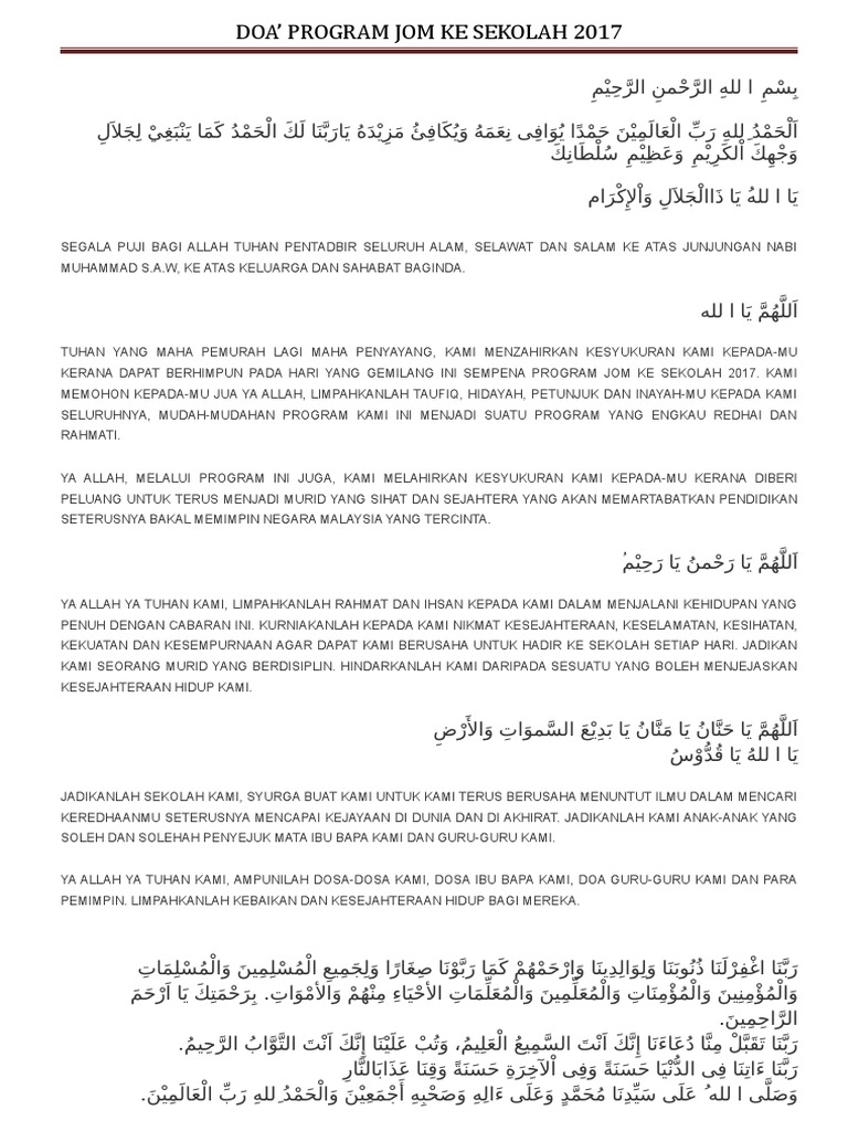 32 Meningkakan peratus kehadiran murid ke sekolah. Doc Skrip Sbp Ikram Rosli Academia Edu. DOA SEMPENA PROGRAM JOM KE SEKOLAH 2017Ya Allah Ya Rahman Ya Rahim Kami berhimpun pada pagi ini kerana-Mu untuk mengisi seluruh ruang hidup kami dengan ibadah kepada-Mu sesuai.