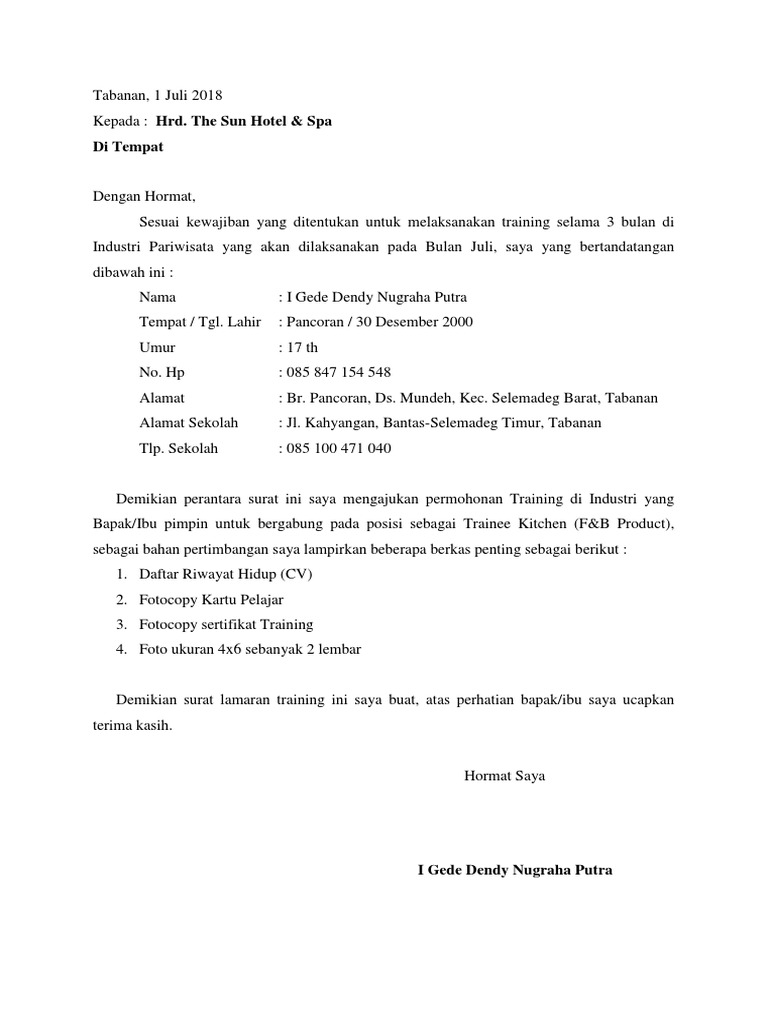 Contoh Surat Lamaran Training Di Hotel Contoh Surat Lengkap Gratis