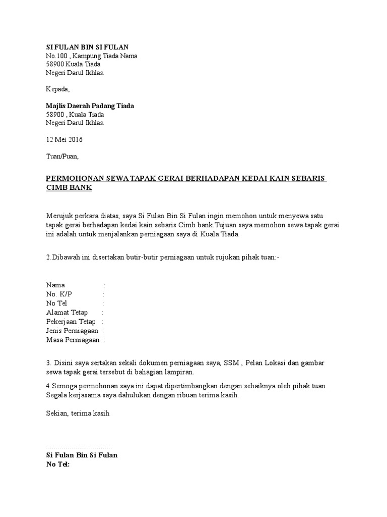 Contoh Surat Permohonan Sewa Tapak Gerai