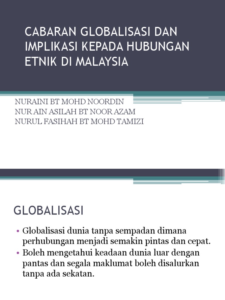 For more information and source see on this link. Untuk melihat kesan globalisasi terhadap hubungan etnik di Malaysia kita harus memerhatikan terlebih dahulu konsep-konsep yang berkaitan dengan hubungan etnik itu sendiri seperti konsep perpaduan asimilasi amalgamasi pluralisme dan perpaduan nasional. Cabaran terhadap hubungan etnik di malaysia dan global Slideshare uses cookies to improve functionality and performance and to provide you with relevant advertising.