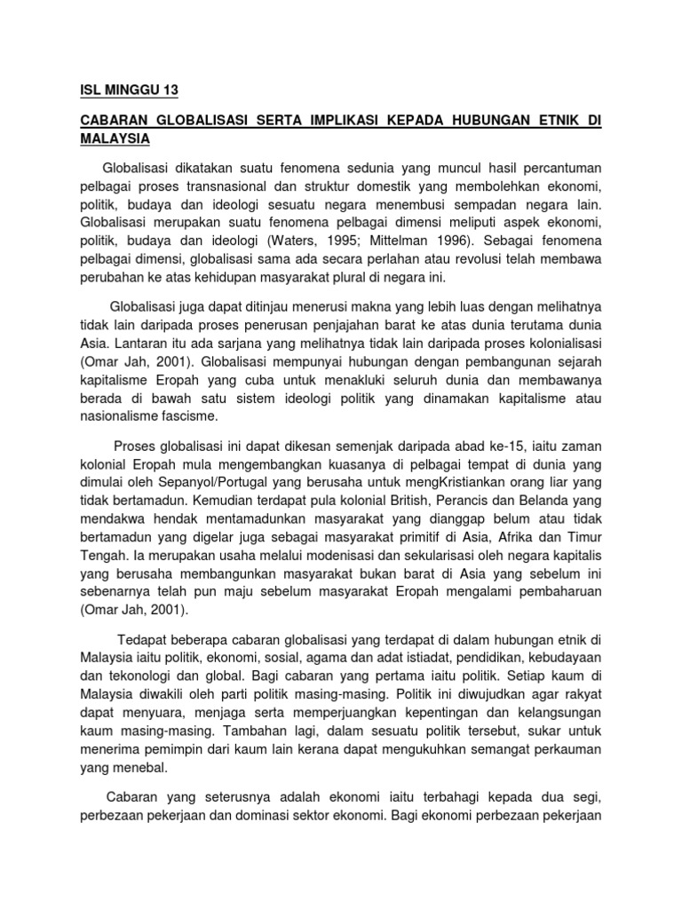 PENGUKUHAN 21 Bincangkan EMPAT 4 cabaran hubungan etnik di Malaysia Huraikan TIGA 3 ciri asas untuk mengurangkan masalah polarisasi kaum yang terdapat dalam Dasar Kebudayaan Kebangsaan Bincangkan TIGA 3 kesan pengabaian hubungan antara etnik. Sehubungan itu terdapat keperluan negara ini mempunyai kaedah mengurus secara khusus bagi tujuan tersebut. Doc Isu Dan Cabaran Globalisasi Pendidikan Di Malaysia Arif Anwar Academia Edu.