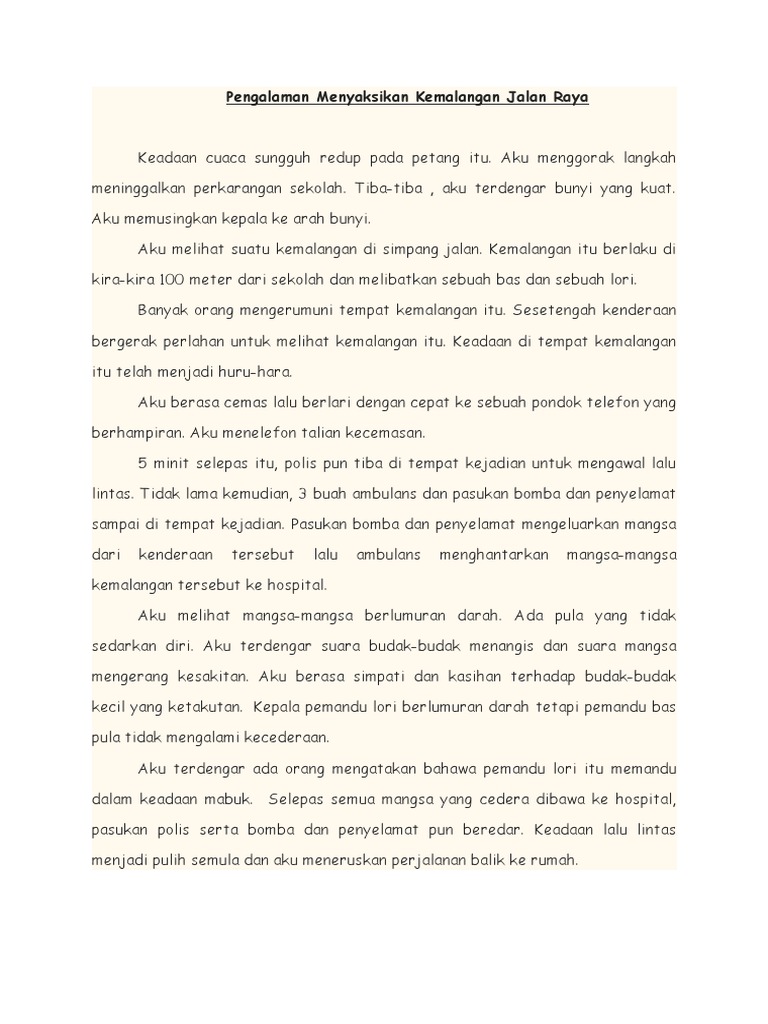 Kebanyakan kemalangan jalan raya berlaku pada musim perayaan. Contoh Karangan Berita Kemalangan Jalan Raya Tahun 5. Berikut adalah contoh karangan mengenai langkah langkah mengatasi kemalangan jalan raya.