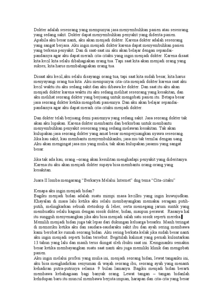 Setelah jadi dokter semua orang di sekeliling langsung mengambil kesimpulan singkat bahwa hidup kalian makmur. Syarat untuk Menjadi Dokter. Saya ingin berbagi cerita tentang cita cita saya atau impian saya dimasa depan dan kenapa saya menginginkannya.