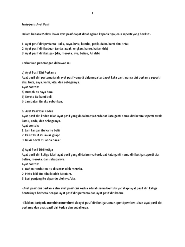 Ayat pasif ialah ayat yang kerjanya a tidak berawalan men- dan didahului kata ganti diri pertama dan kata ganti diri kedua. Merujuk kepada diri sendiri apabila bercakap dengan orang rapat. B berawalan di- dan diikuti kata sendi oleh serta kata ganti diri ketiga.