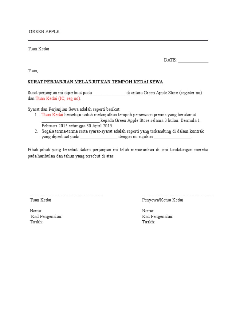 Semoga dapat menjadi sumber informasi dan bahan referensi dalam membuat surat perjanjian sewa yang baik. Premis Contoh Surat Perjanjian Sewa Kedai Yang Ringkas. Biasanya surat perjanjian sewa kedai ini dibuat tempoh selama 2 tahun.