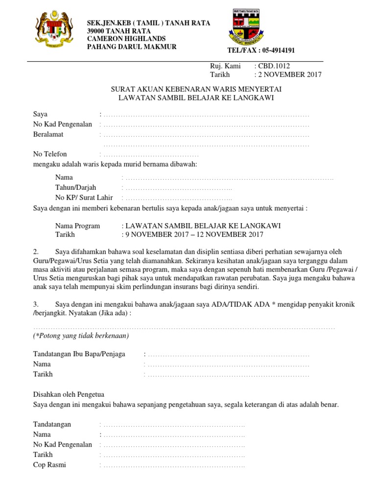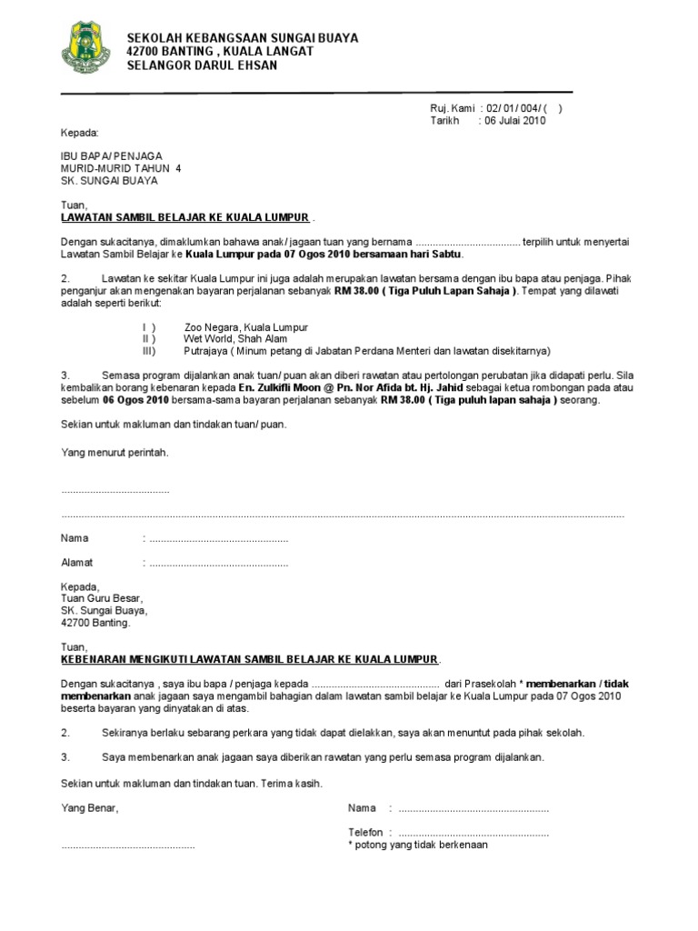 Contoh Surat Kebenaran Ibubapa Aktiviti Sukan Lawatan Dan Kokurikulum Di Sekolah Portal Cikgu