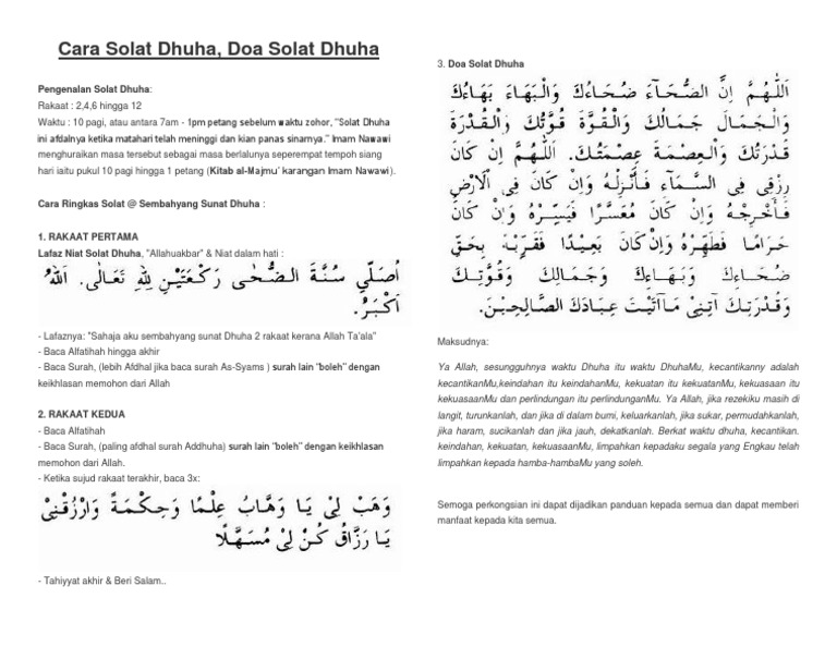 Apa yang penting solat tersebut diniatkan dengan betul syarat-syaratnya dipenuhi dan rukun-rukunnya disempurnakan sebaik-baiknya. Cara Solat Dhuha Yang Mudah Berserta Doa. Di bawah ini adalah panduan lengkap cara bagaimana mengerjakan soalt sunat dhuda dan cara bacaan doa dhuha yang ringkas mengikut sunnah Solat sunat dhuha adalah alsah satu solat sunat yang dituntut dilakukan oleh setiap umat islamSolat sunat dhuha ini juga sering disebut sebaagai amalan pembuka rezeki yang mempunyai pelbagai kelebihanJom baca cara solat dhuha lengkapa.