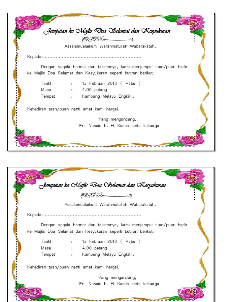 Contoh Kad Jemputan Majlis Tahlil Dan Doa Selamat cara kira zakat perniagaan cara kiraan zakat pendapatan selangor cara memohon lesen penjaja tepi jalan melaka cara kiraan zakat pendapatan sabah cara kira potongan kwsp kerajaan cara memohon kerja melalui email bahasa melayu cara memohon bantuan ibu tunggal cara membuat minit mesyuarat kali pertama cara masuk islam di malaysia cara. 6 Contoh Doa Majlis Kesyukuran Ringkas Beserta Maksud Dalam Rumi Boleh Print PDF Doa majlis kesyukuran dan doa selamat sering dibacakan dalam majlis-majlis kesyukuran sama ada majlis rasmi separuh rasmi atau kasual. JEMPUTAN KE MAJLIS BACAAN YASIN DOA SELAMAT SOLAT HAJAT DAN PENGHARGAAN PASTI PUTRA PERMAI Dengan sukacitanya kami ingin menjemput tuanpuan sekeluarga ke Majlis Bacaan Yasin Doa Selamat Dan Penghargaan Pasti Putra Permai pada.