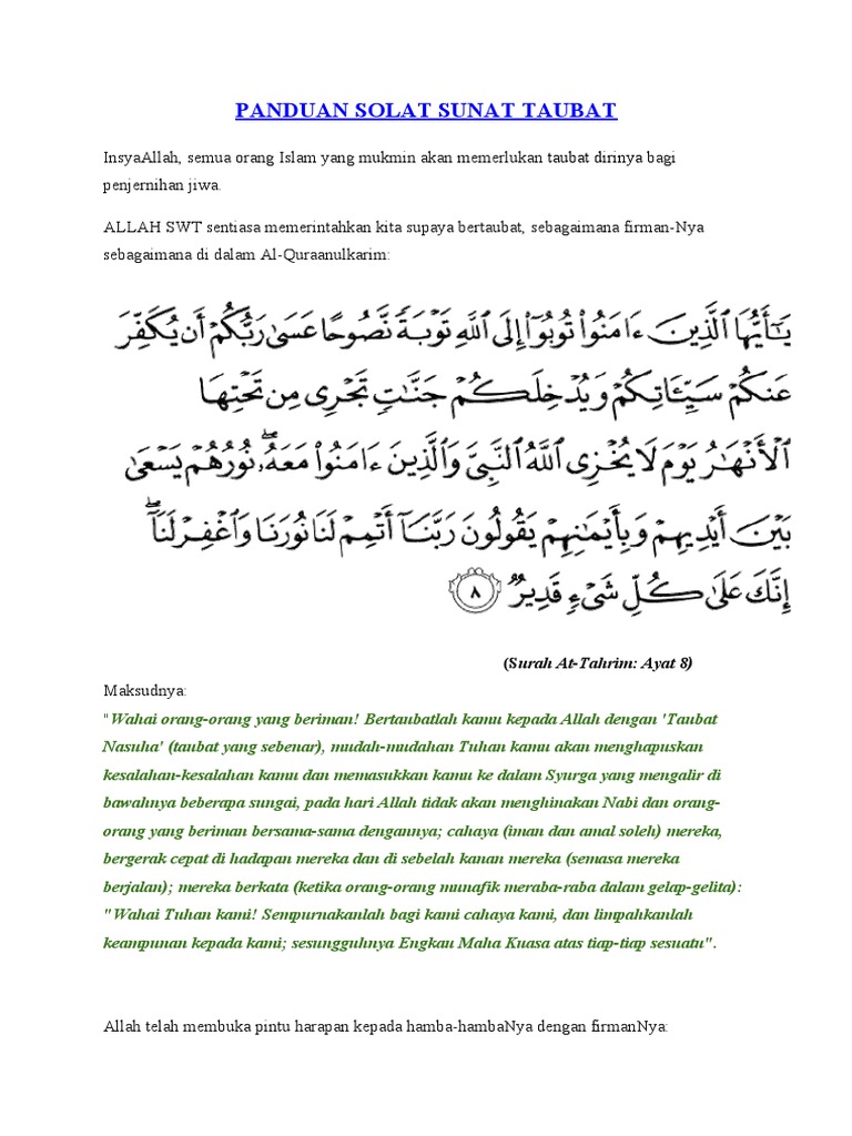 Atau yang mudah di baca dari ayat alquran. Panduan ini akan membimbing anda melakukan taubat nasuha secara lengkap. Solat sunat taubat boleh dilakukan pada bila-bila masa selain daripada waktu yang diharamkan untuk mengerjakan solat.