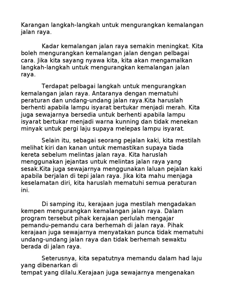 Isu ini tidak seharusnya dibiarkan kerana ia dikhuatiri turut mengancam nyawa orang lain. Contoh Karangan Bahasa Melayu PT3. Sempena Minggu Keselamatan Jalan Raya peringkat sekolah anda selaku pengerusi kelab telah diminta untuk memberi ceramah dalam perhimpunan sekolah.